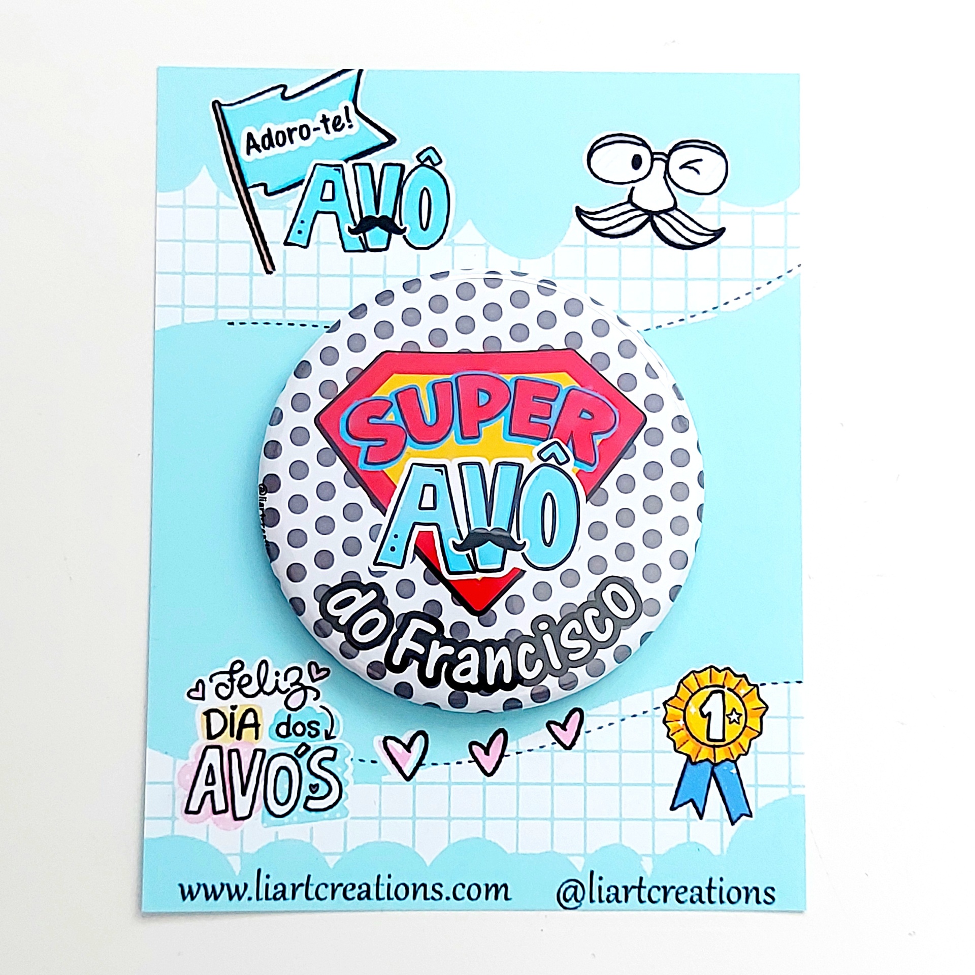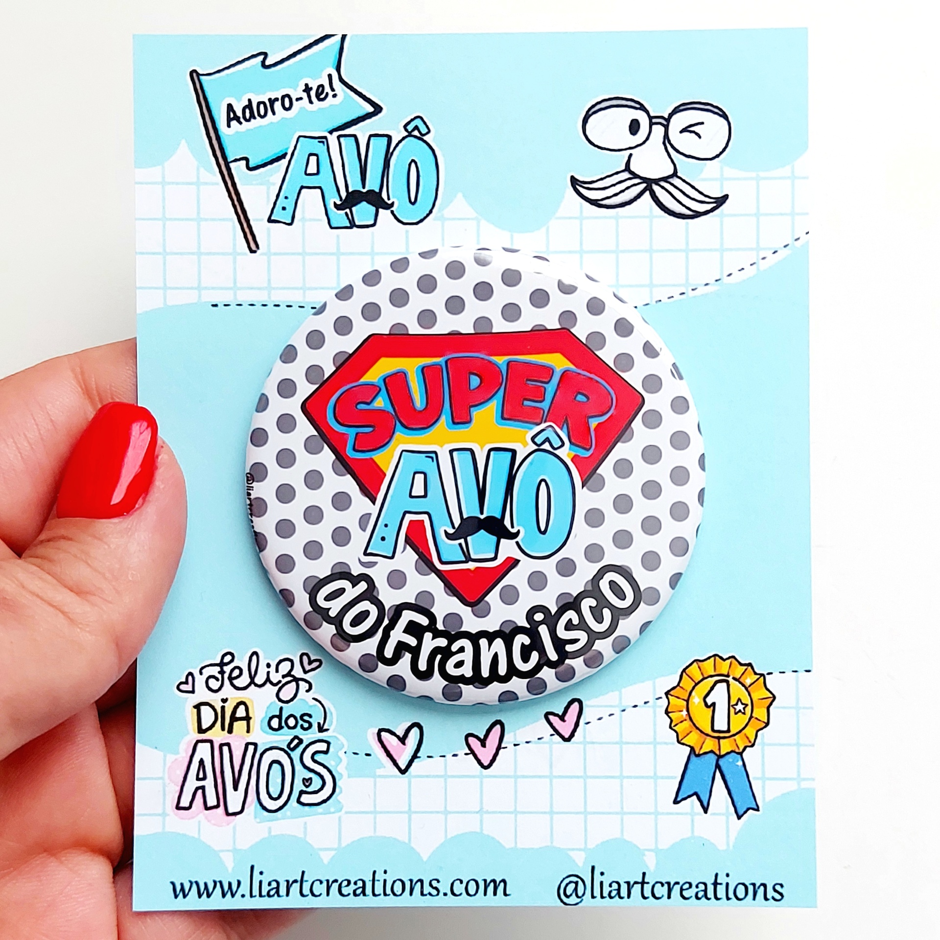 Home Avós Iman personalizado "Super Avô" Iman personalizado "Super Avô" SKU: IMNA04 5,00 € Desconto de %. IVA incluído. Adicionar Contactar Adicionar à wishlist Iman personalizado "Super Avô" Medida: 59mm PRAZO DE PRODUÇÃO/EXPEDIÇÃO: 5 dias úteis. Nota: o cartão que acompanha o iman poderá ser diferente, caso a encomenda seja feita numa época diferente da data comemorativa do dia dos avós. Partilhar